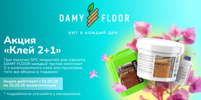 - При покупке усовершенствованного кварцевого SPC ламината DAMY FLOOR коллекций Family, London, Chevron и Ascent Strong и нашего фирменного двухкомпонентного клея и грунтовки DAMY FLOOR, каждая третья банка клея и грунтовки в подарок!