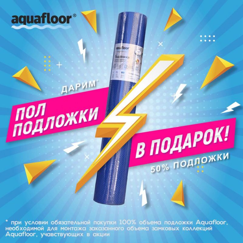 При покупке напольного покрытия ТМ AQUAFLOOR 50% от стоимости подложки вам будут предоставлены в подарок!